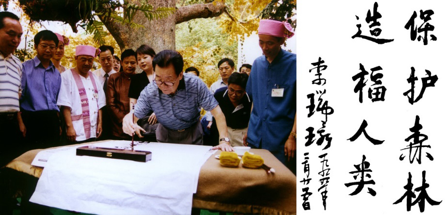 1999年3月,時任中共中央政治局常委、全國政協(xié)主席李瑞環(huán)到西雙版納森林公園參觀視察,并欣然題詞:“保護森林,造福人類”。