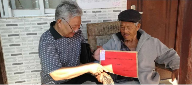 ▲慰問(wèn)寧洱縣同心鎮(zhèn)同心村金竹林老兵羅文英。羅文英是老復(fù)員軍人,1953年入伍,1954年入黨,務(wù)農(nóng)收入低,條件差。
