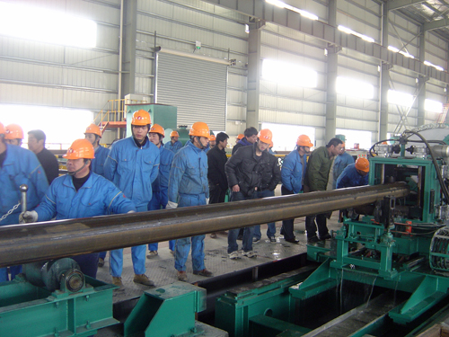 1月22日上午,金洲管道工業(yè)有限公司219車間飛鋸旁,制造部總經(jīng)理鄭榮、項目籌建處處長沈榮華、技術(shù)設(shè)備處長陳文豪、設(shè)備安裝調(diào)試工程師等正關(guān)切地注視著生產(chǎn)線上狀況。經(jīng)過短短的幾分鐘,從飛鋸設(shè)備上傳來“嗞嗞”的聲音,第一根Φ219直縫焊鋼管緩緩駛下了生產(chǎn)線,現(xiàn)場的公司領(lǐng)導(dǎo)和每位職工親身見證了這一期盼已久并將載入金洲發(fā)展史冊的光榮時刻。